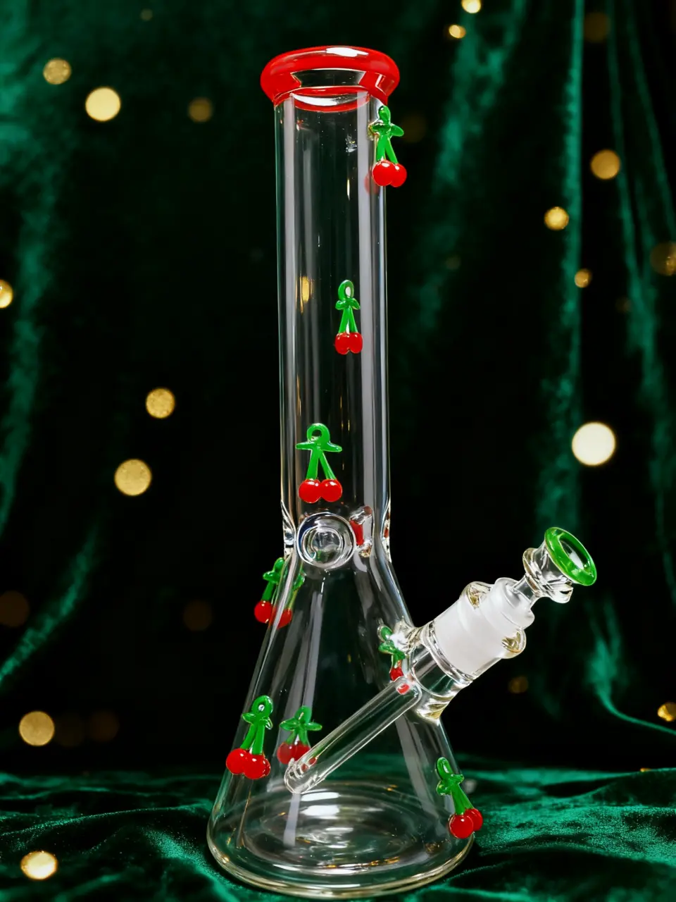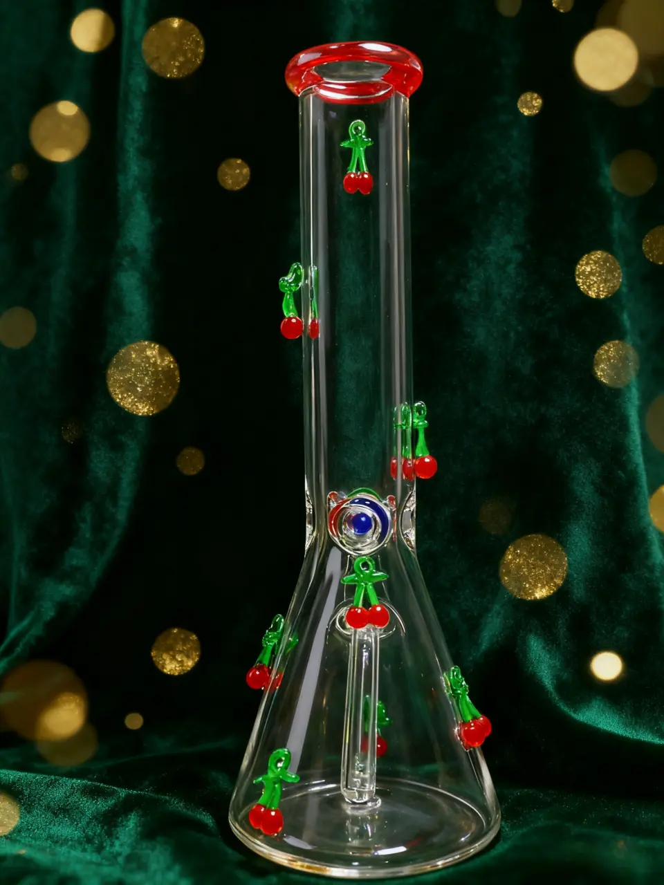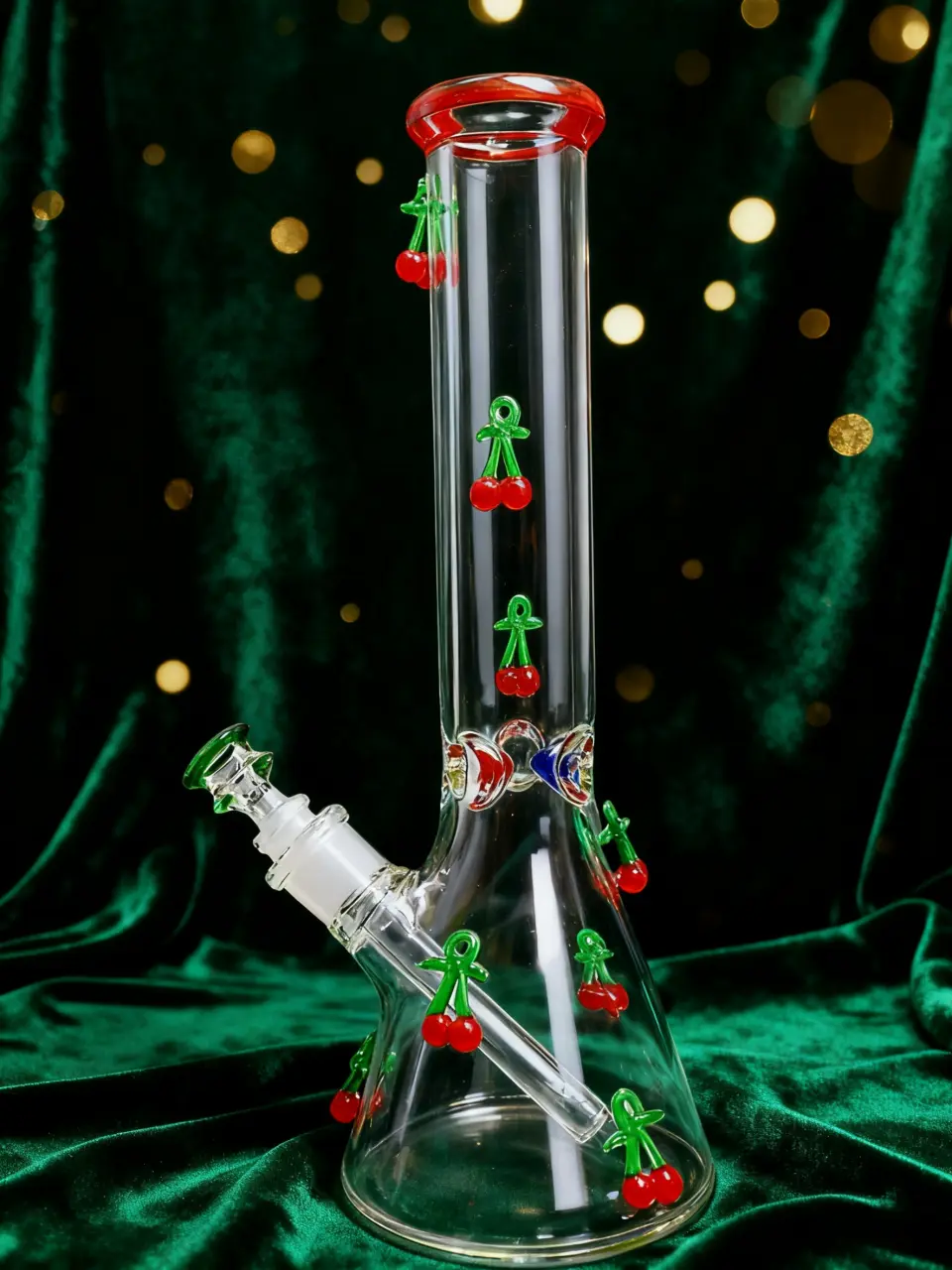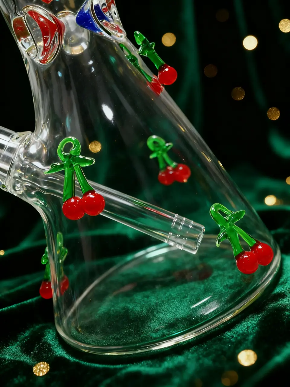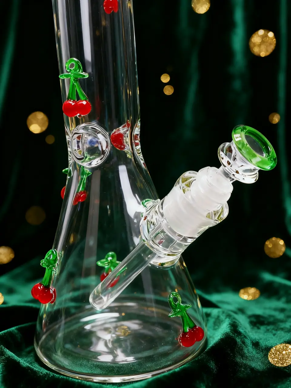 This 14-inch clear beaker bong is a fresh, playful celebration of all things fruity and fun. Handcrafted 3D cherries in bright red with green stems dot the neck and body, giving the piece a lively, dimensional look that’s impossible to miss.