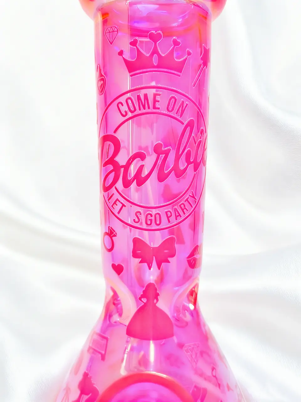 The glass is adorned with a fun, eye-catching Barbie logo, surrounded by playful designs of crowns, butterflies, and diamonds.