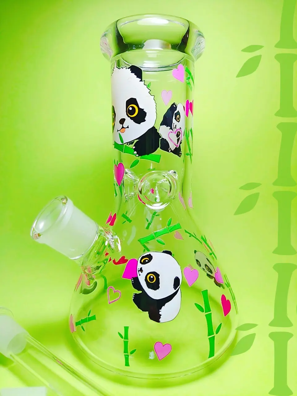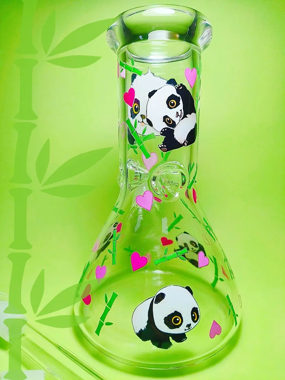 🐼 This classic clear beaker bong is basically a panda party in glass form. Adorable pandas strike all the cutest poses—nibbling bamboo, lounging, or just being irresistibly squishy—while hot pink hearts and bamboo leaves float around like confetti for your inner panda queen.