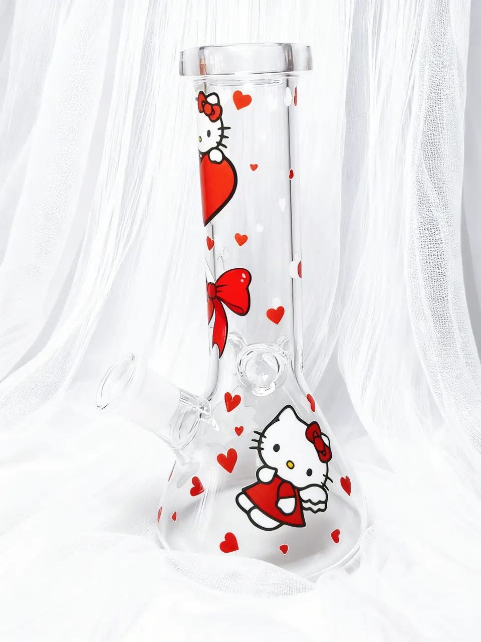 ❤️🎀 Celebrate classic cuteness with this Hello Kitty-themed beaker glass bong. The body features Kitty’s head holding a big red heart, her signature red bow, and scattered mini hearts. On the base, a full-body Kitty in a matching red outfit adds extra charm and collectible appeal.