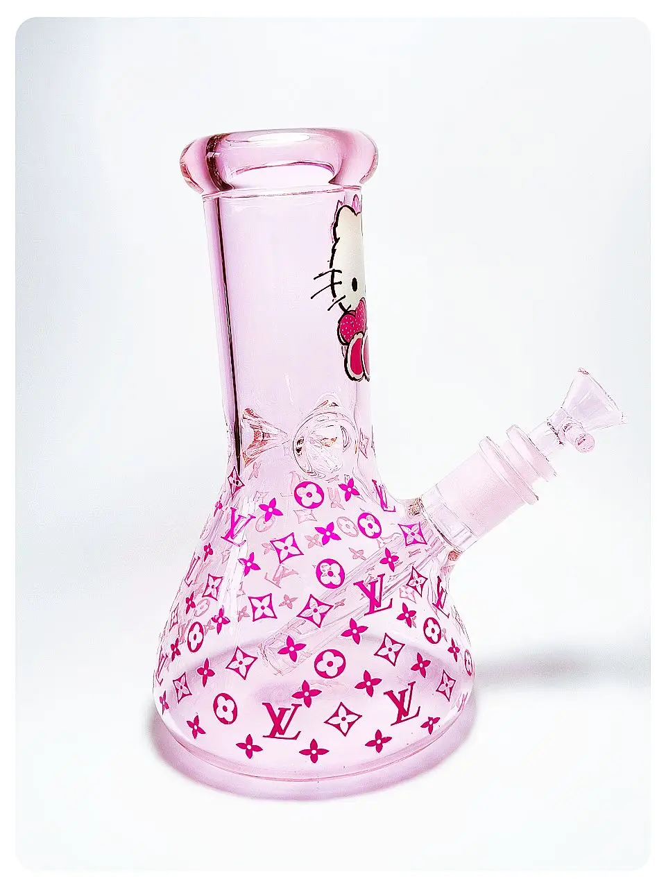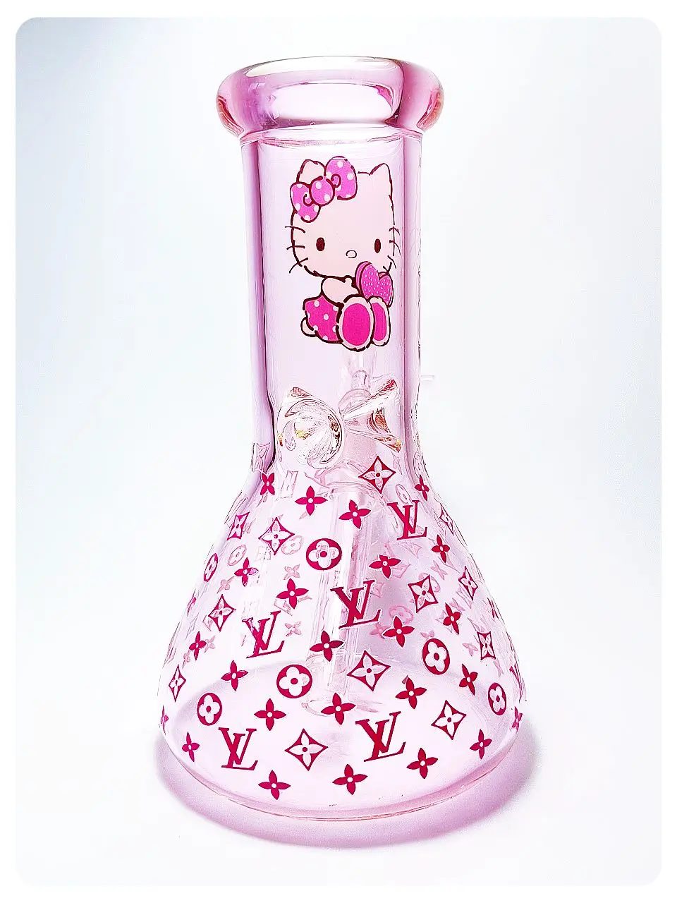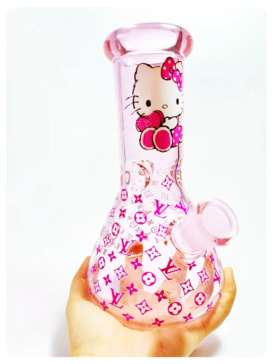 🐱💖 This light pink glass bong is adorably playful—Hello Kitty rocks a pink bow and a fun outfit right in the center, while pink LV-style logos cover the rest, giving it a cute-meets-luxury vibe.