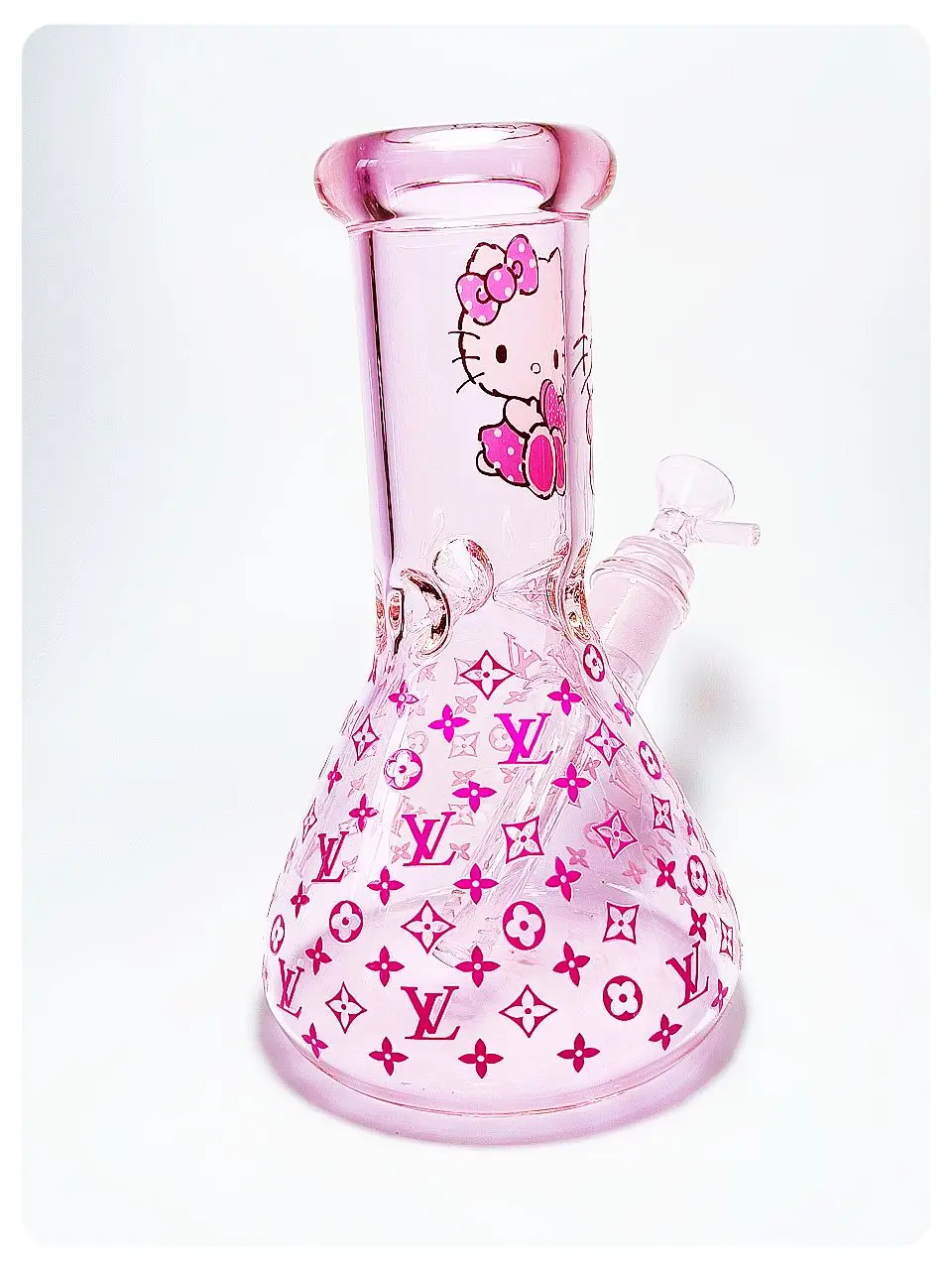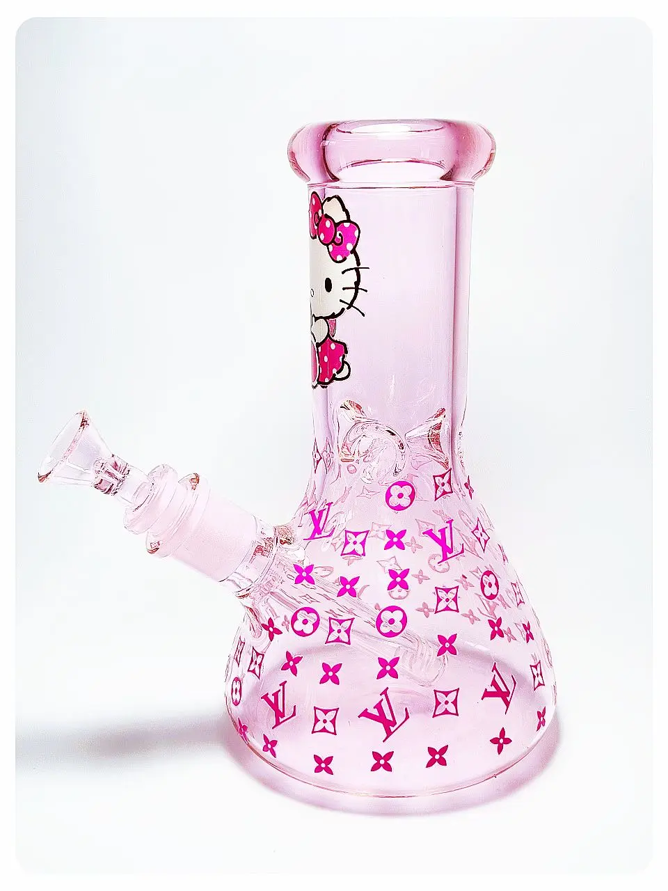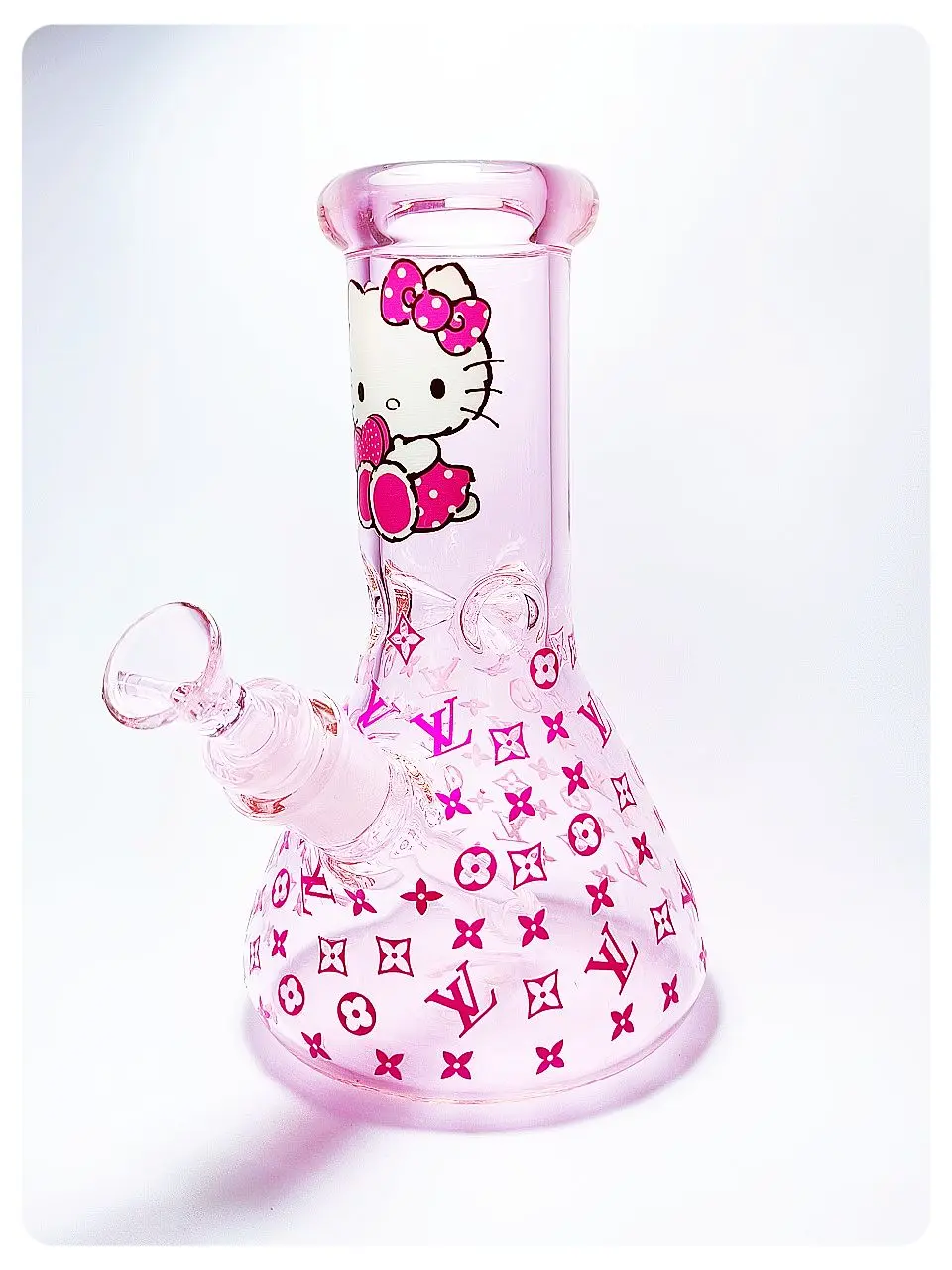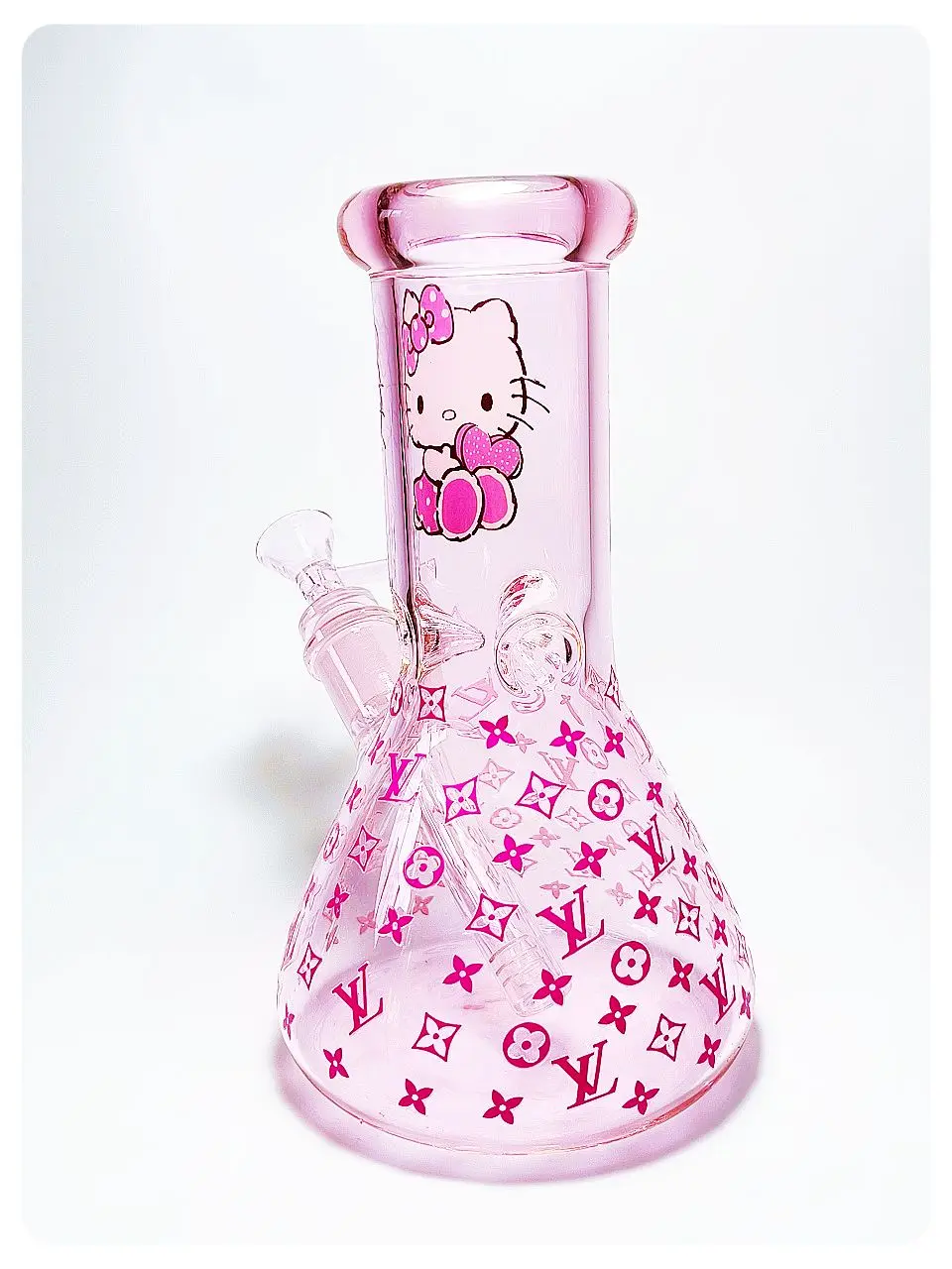 🐱💖 This light pink glass bong is adorably playful—Hello Kitty rocks a pink bow and a fun outfit right in the center, while pink LV-style logos cover the rest, giving it a cute-meets-luxury vibe.