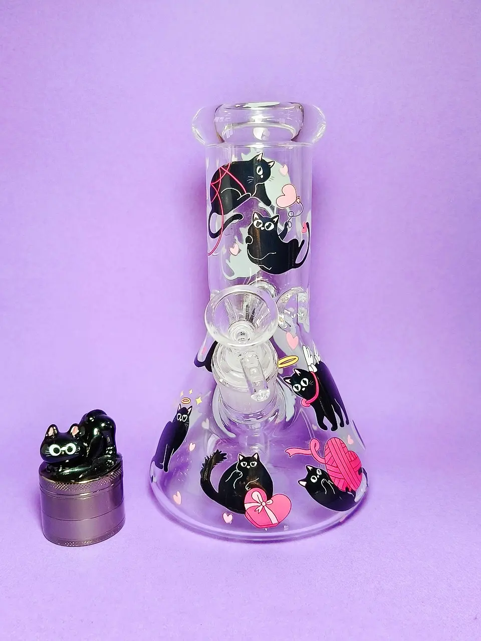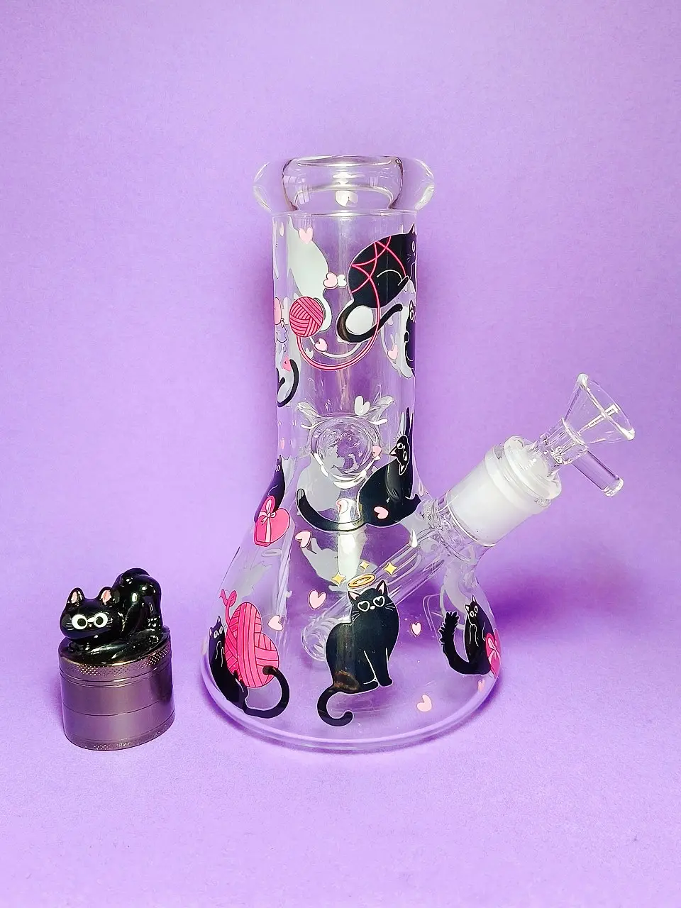 This 8 inch straight tube bong is made from 5mm thick durable borosilicate glass and features a clear body decorated with playful black cats, yarn balls, and sweet hearts for a charming touch.